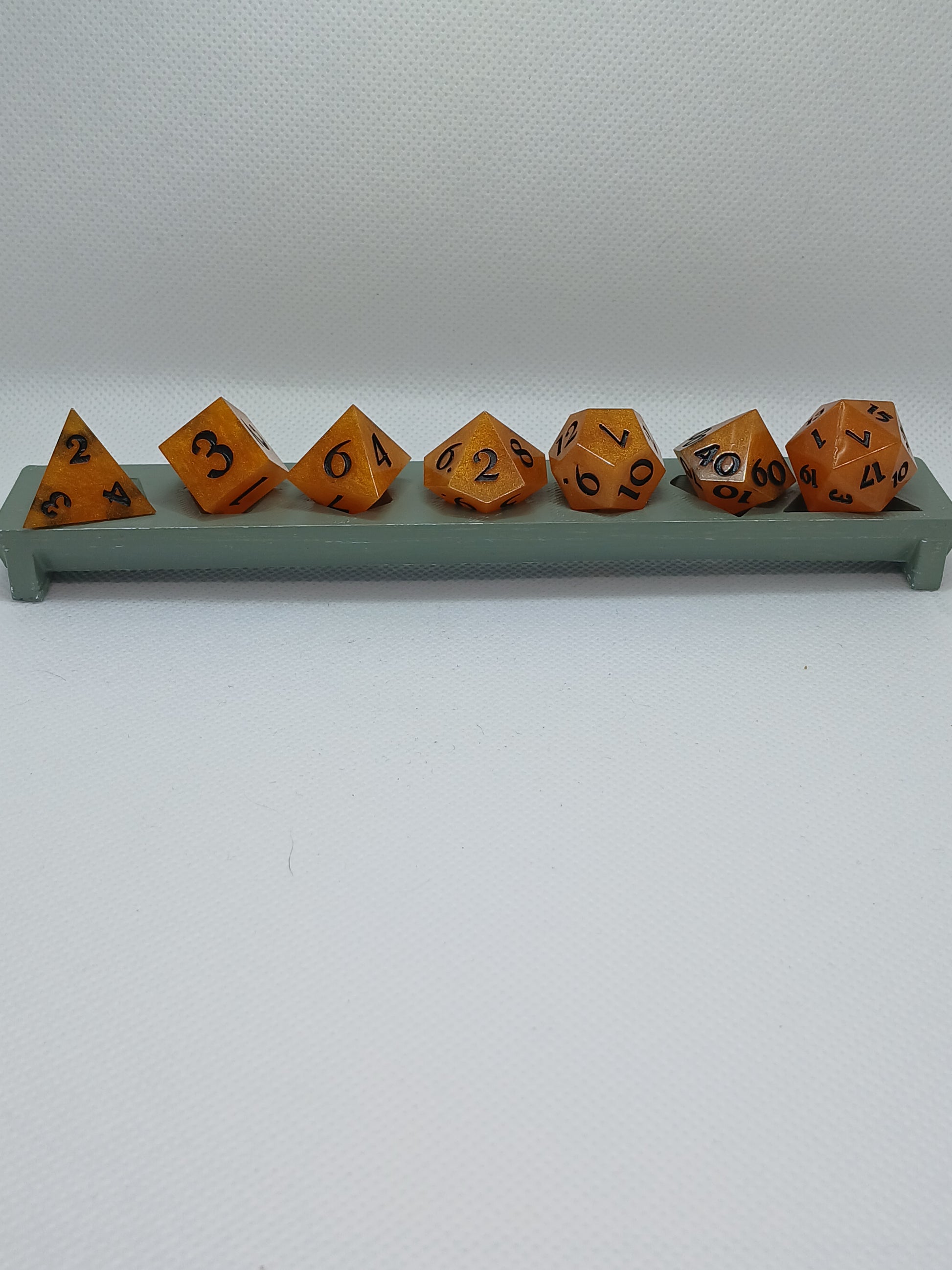 Home made Dice in Resin. Orange with black numbers.