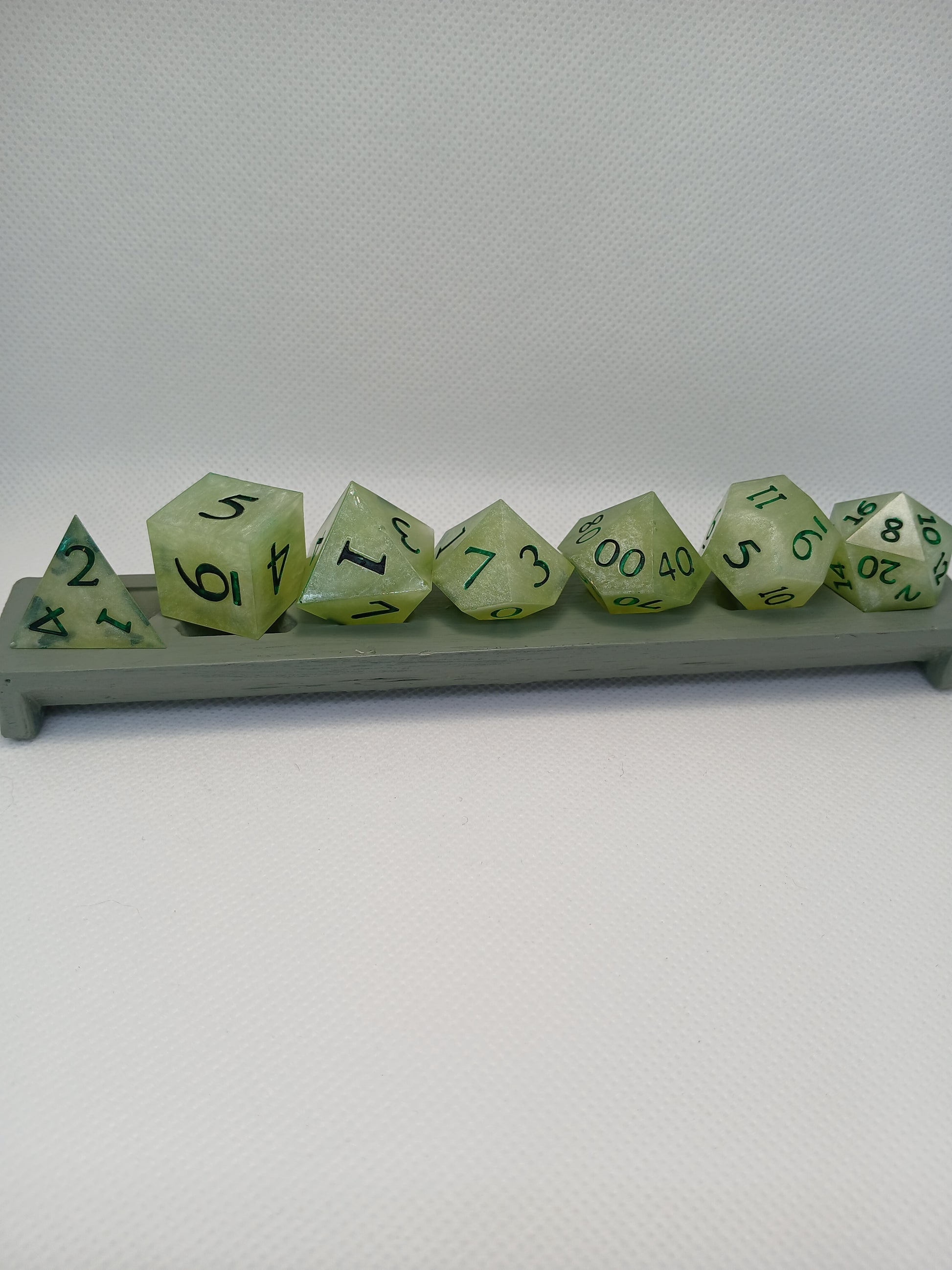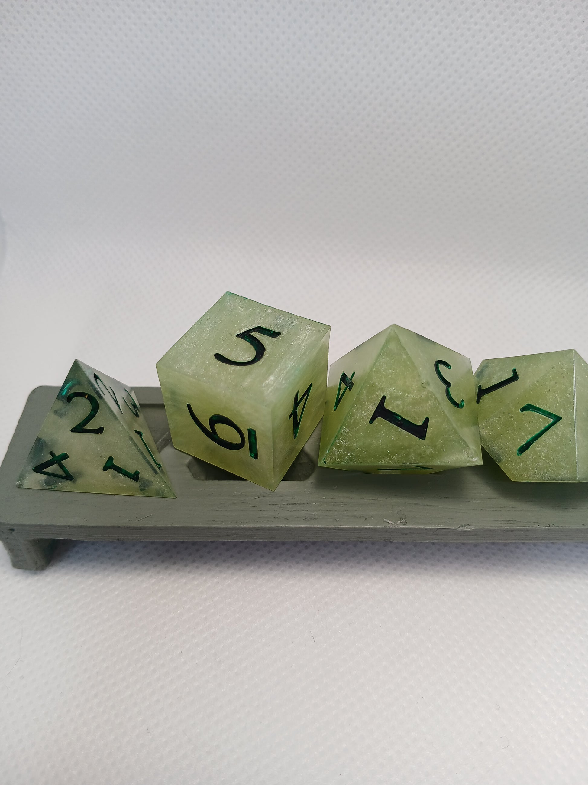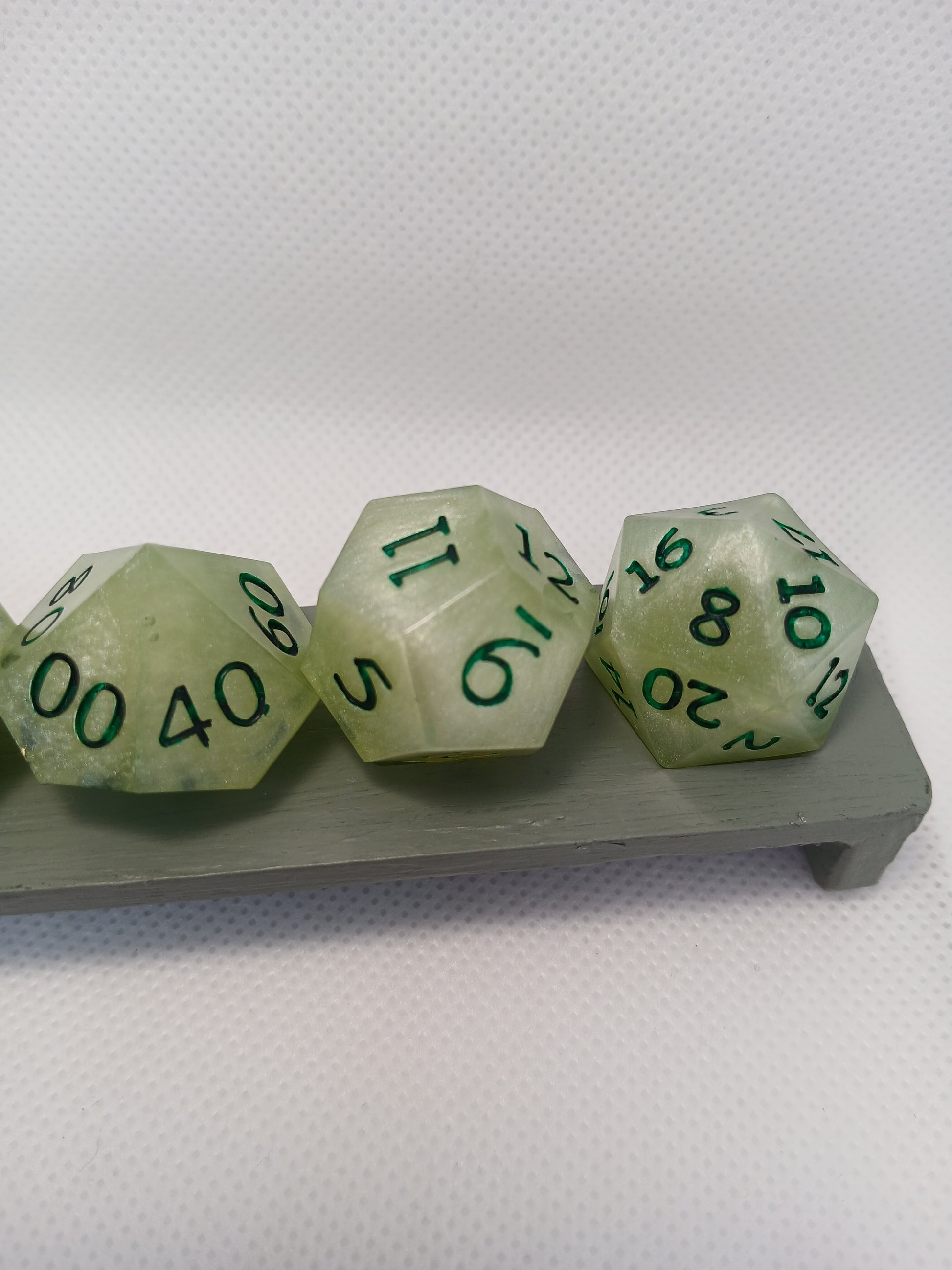 Home made Dice in Resin. Light green with dark green numbers.