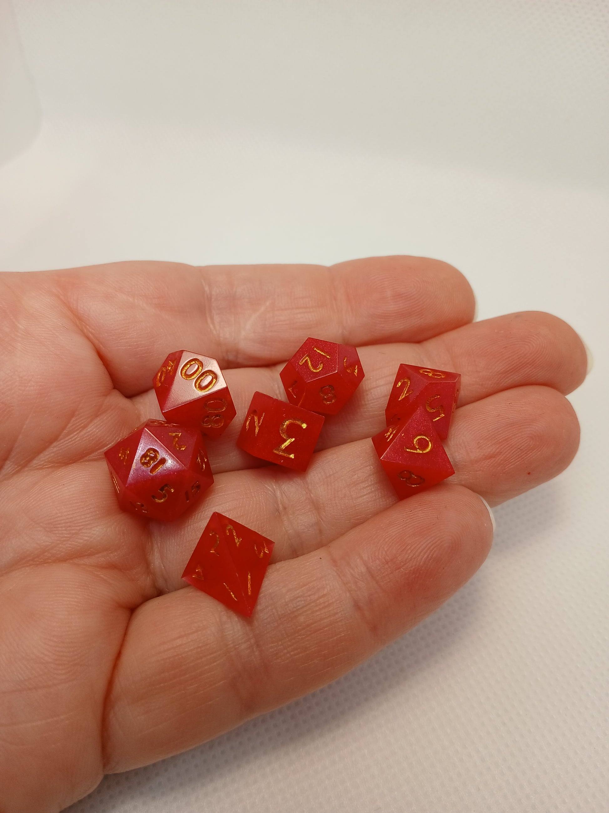 Home made Dice in Resin, Pink with golden numbers.