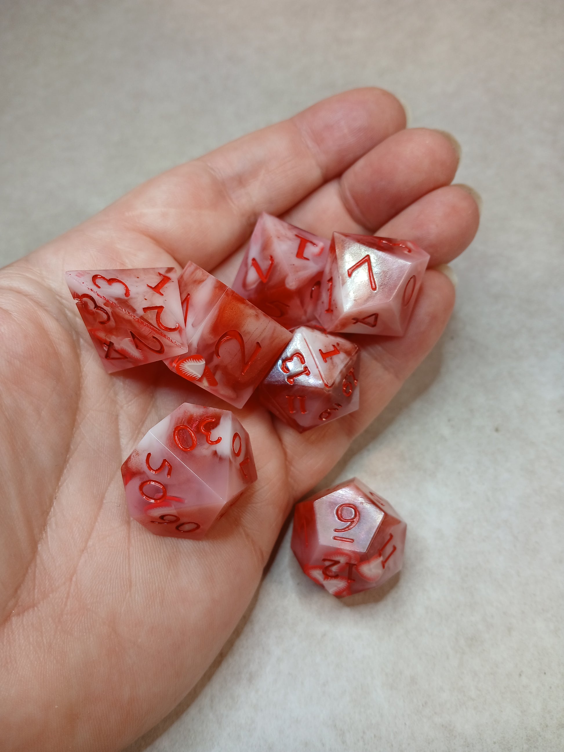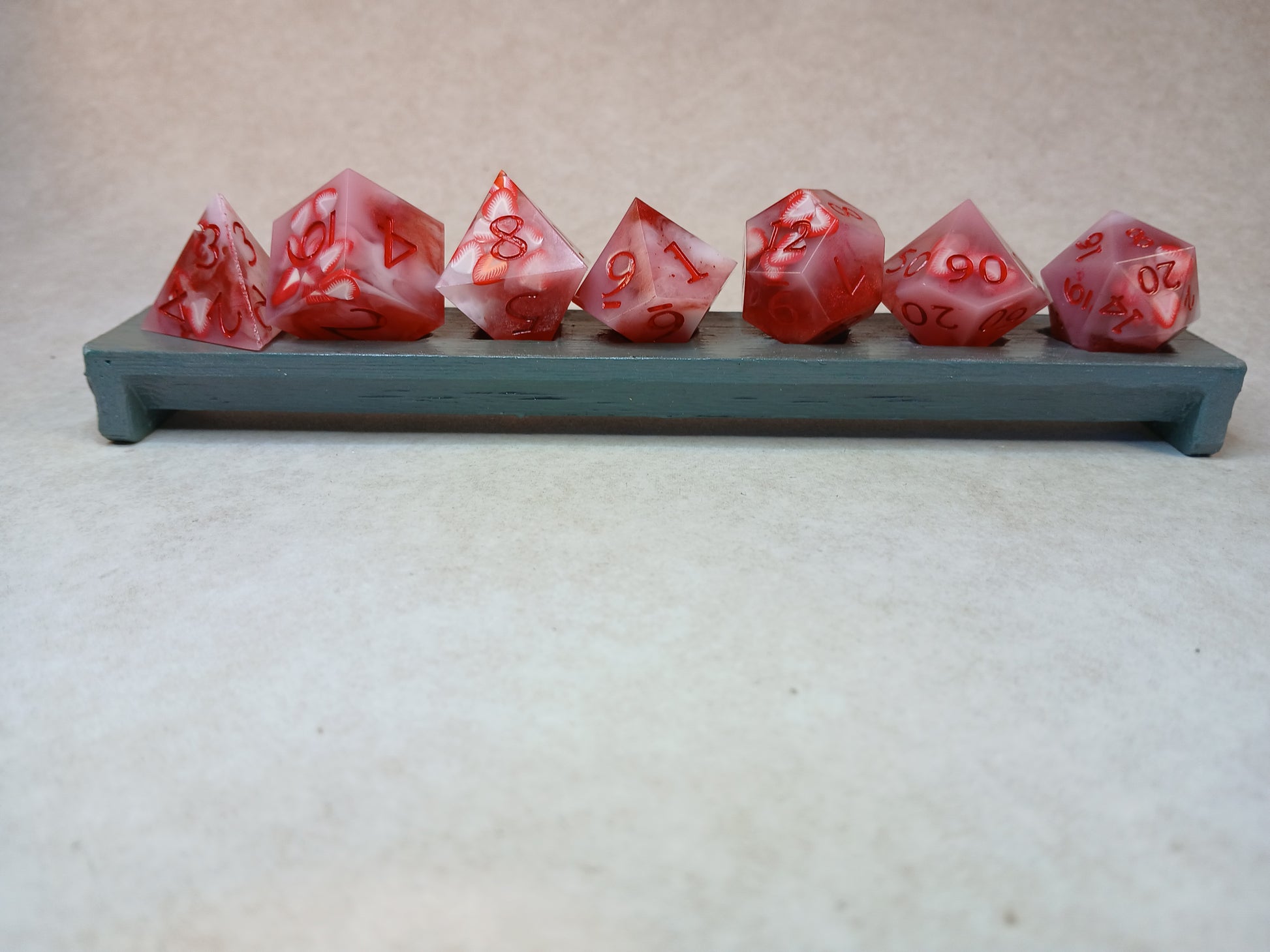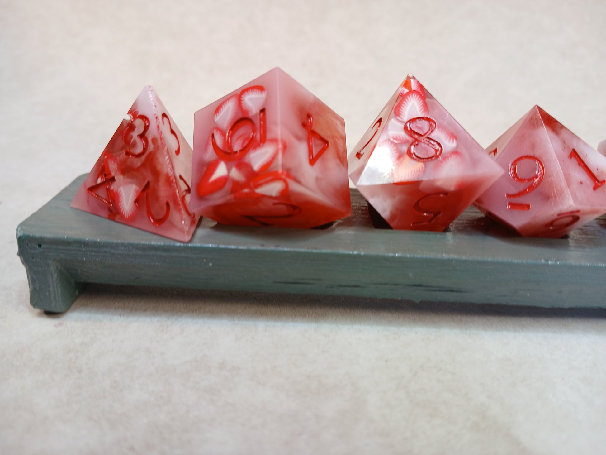 Dice in Resin, "strawberry" with red numbers.