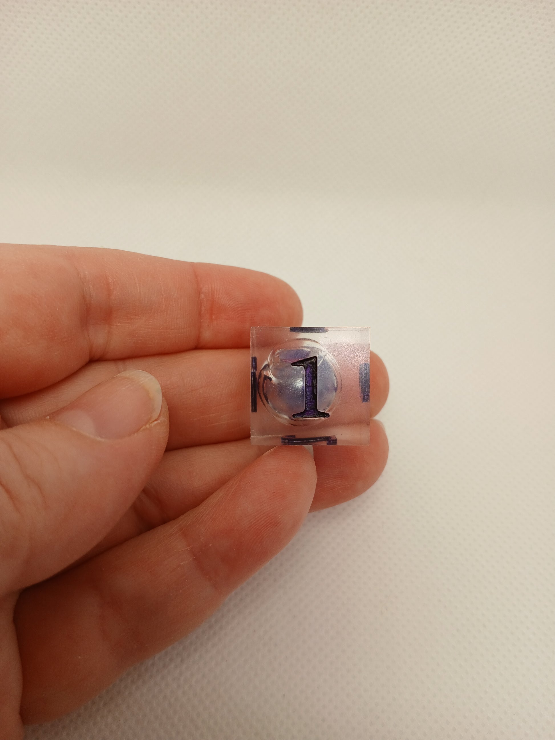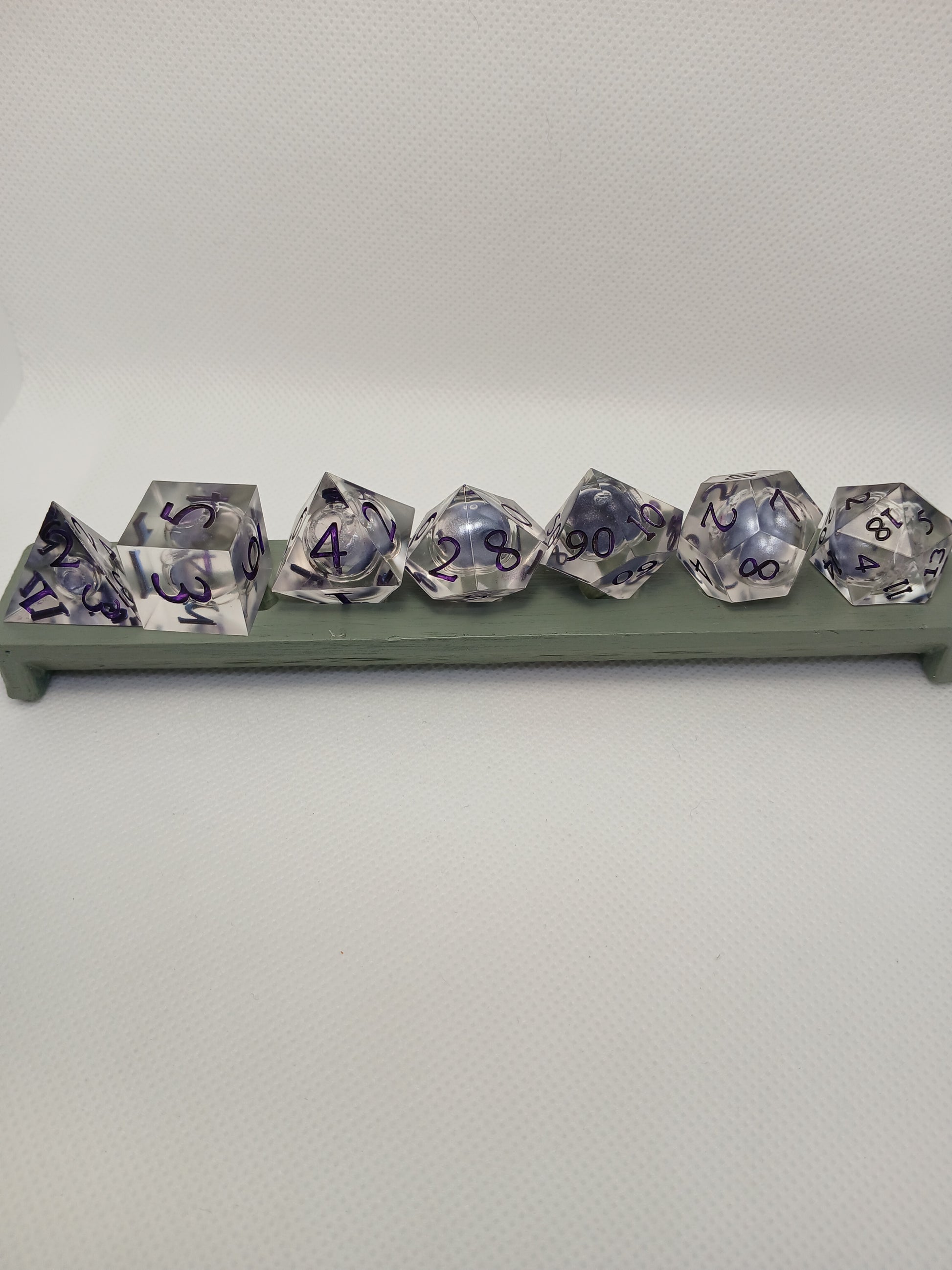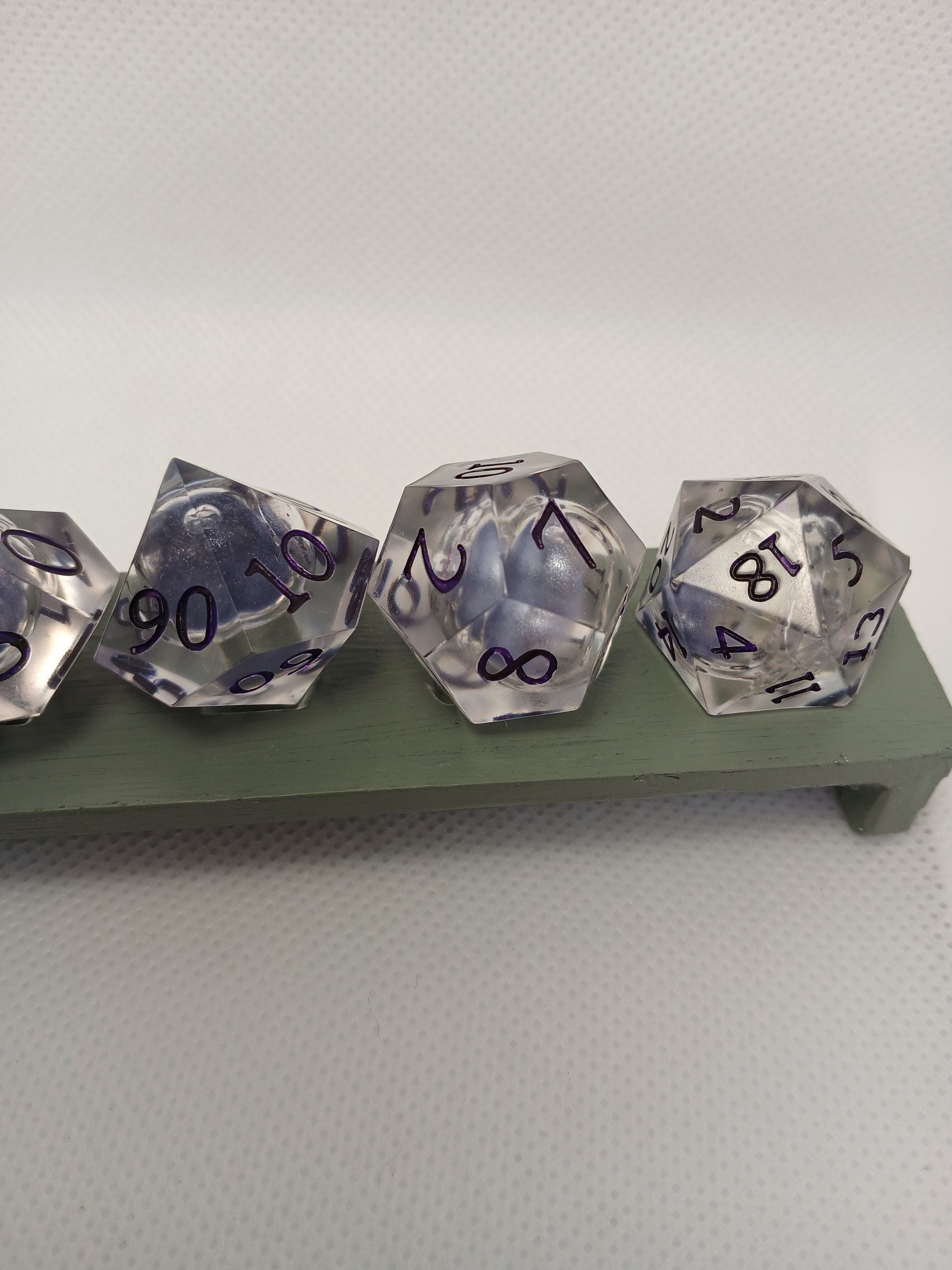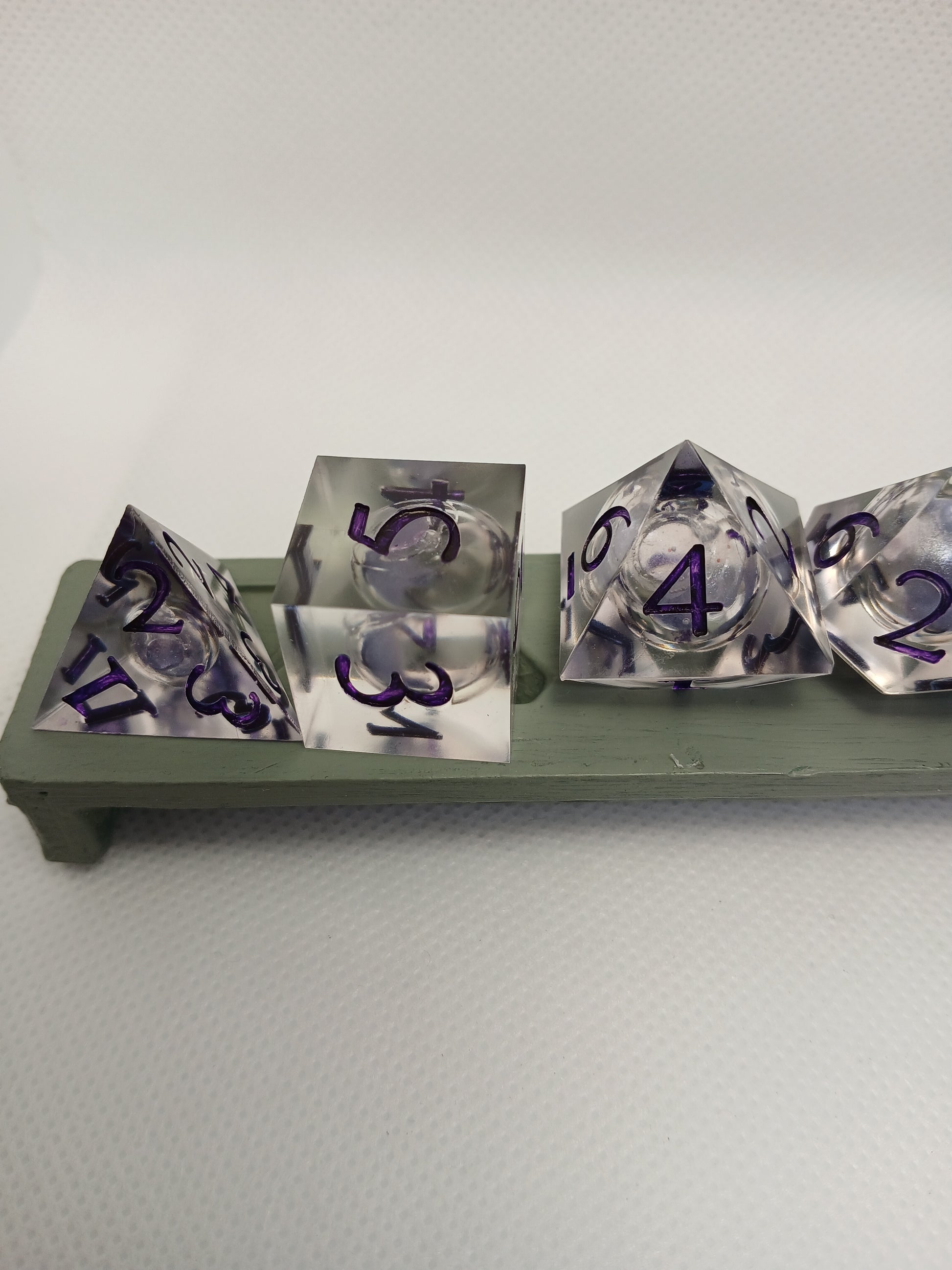 Home made Dice in Resin. Transparent with lilac liqued core, Lilac numbers.