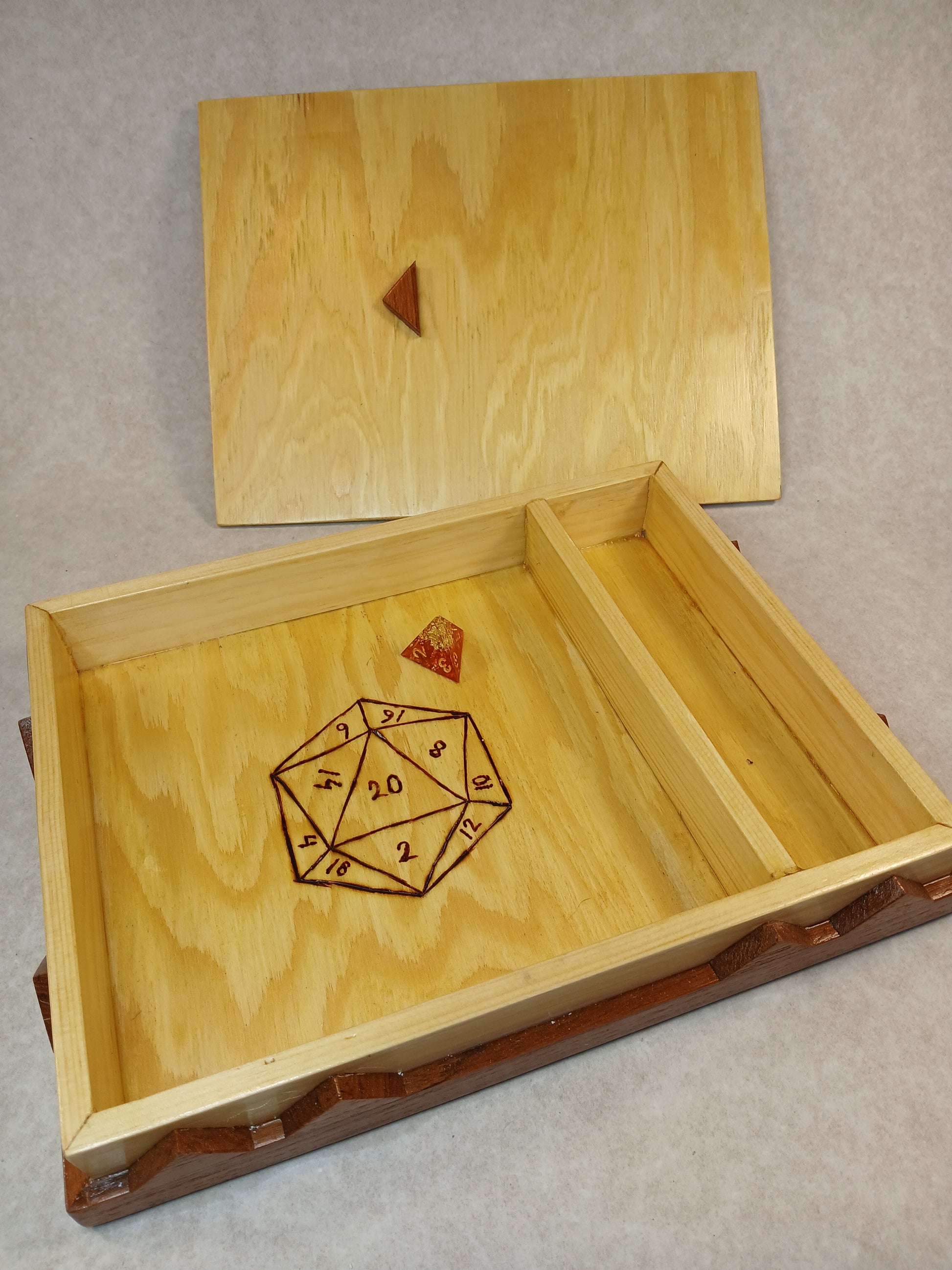 The small compartment is for storing dice during the game. Handmade and decorated.